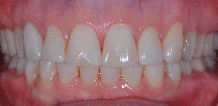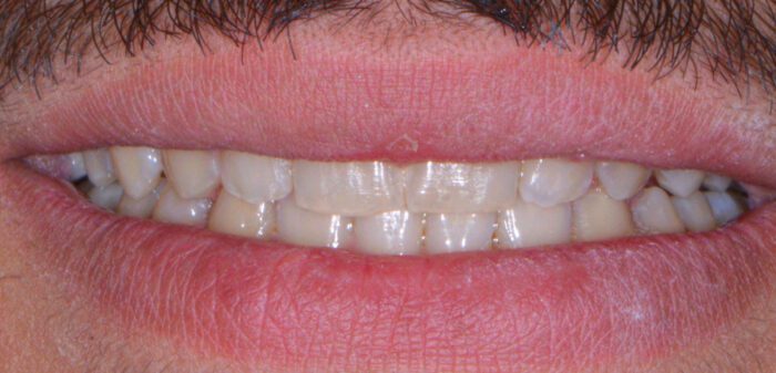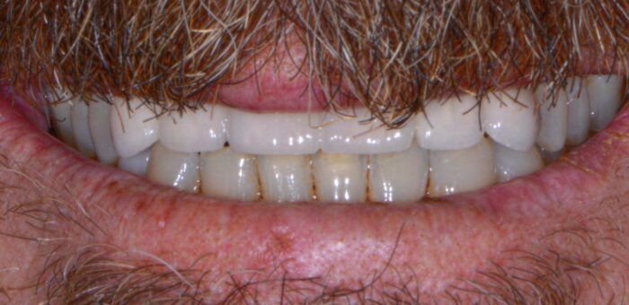 Years of grinding and clenching had chipped and reshaped this patient’s teeth. He was eager to see if there was a way to bring back the smile that his wife fell in love with! After these porcelain crowns were cemented, we made the patient a custom night-guard to help avoid further damage to his teeth from his nighttime grinding habit. Longevity is always part of the goal!