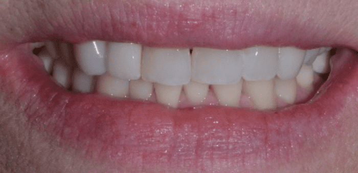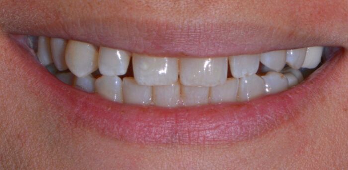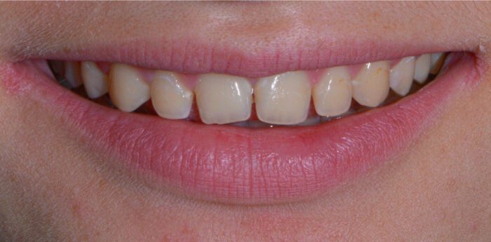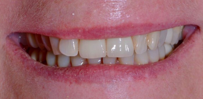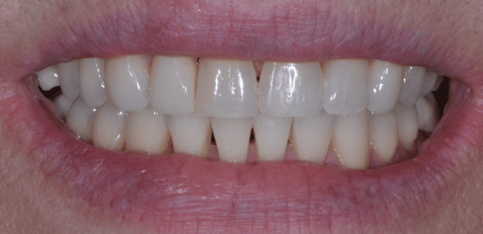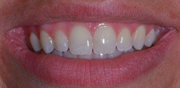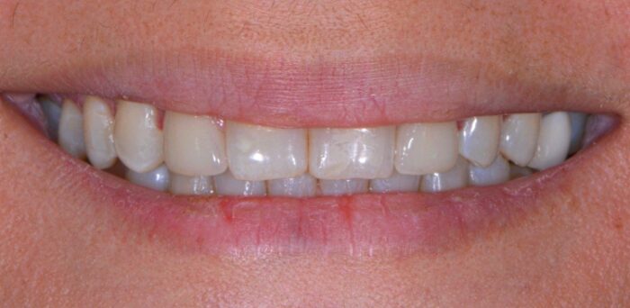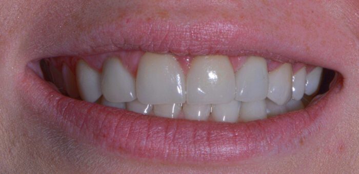 This patient was unhappy with both the spacing and the shade of her teeth. After very conservative tooth preparations, custom porcelain veneers were hand-crafted by our ceramist. We always aim for a natural shade that complements our patients’ facial architecture. Now, her newly enhanced smile lights up the room!