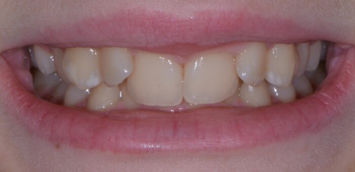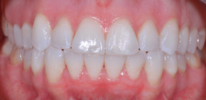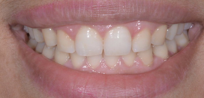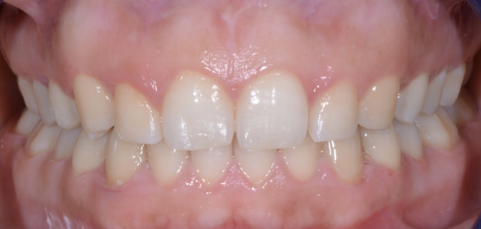 This patient was so happy with her awesome clear aligner results! In just 11 months, we were able to correct fairly significant crowding and get her smile and her bite lined up really nicely!